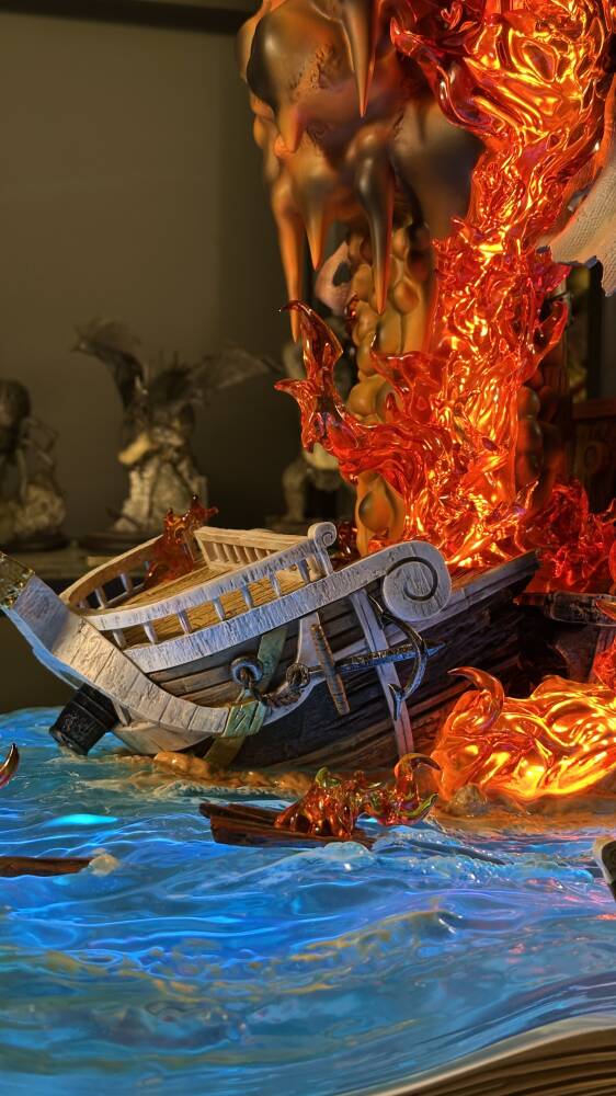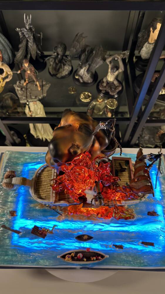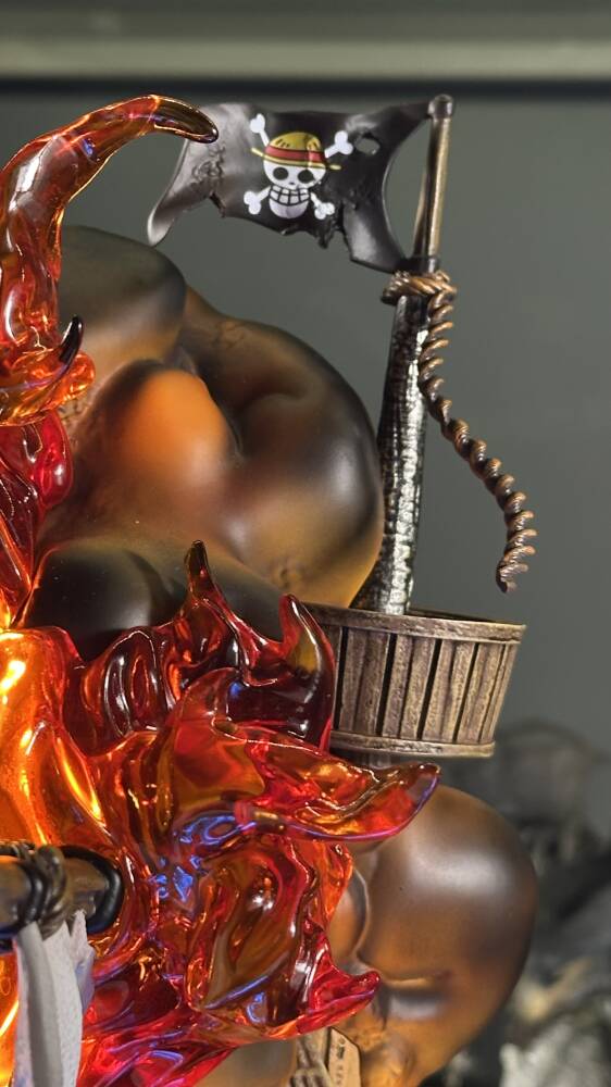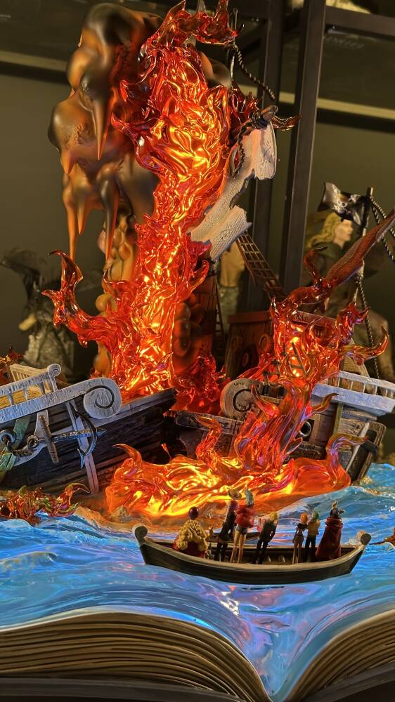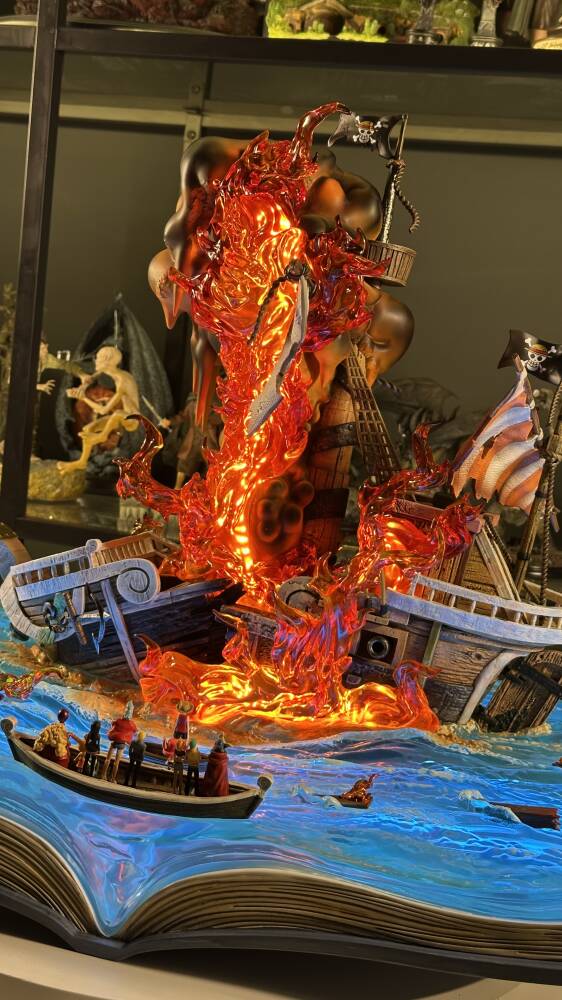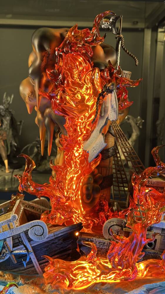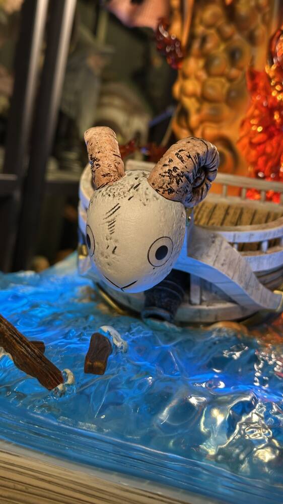 One Piece evreninin efsanevi gemisi Going Merry, Straw Hat Pirates tayfasının ilk yol arkadaşı olarak anime tarihinin en duygusal sembollerinden biridir. Wasp Studio – Going Merry, geminin ikonik yüz ifadesini, yelkenlerini, güverte detaylarını ve ahşap dokusunu yüksek hassasiyetle yansıtır. Dinamik deniz temalı taban ve güçlü renk kontrastları, eseri vitrinlerde dikkat çekici bir merkez parça haline getirir.