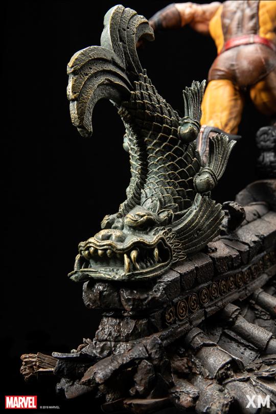 80’ler–90’ların ikonik “Brown Suit” görünümüyle Wolverine, Japon mimarisinden ilham alan kiremitli çatı üzerinde pusuya hazırlanıyor. Dinamik sıçrama pozu, kükreyen baş portresi ve yüzey dokularındaki ince işçilik; Frank Miller döneminin sert estetiğini ve karakterin vahşi doğasını güçlü biçimde yansıtıyor.